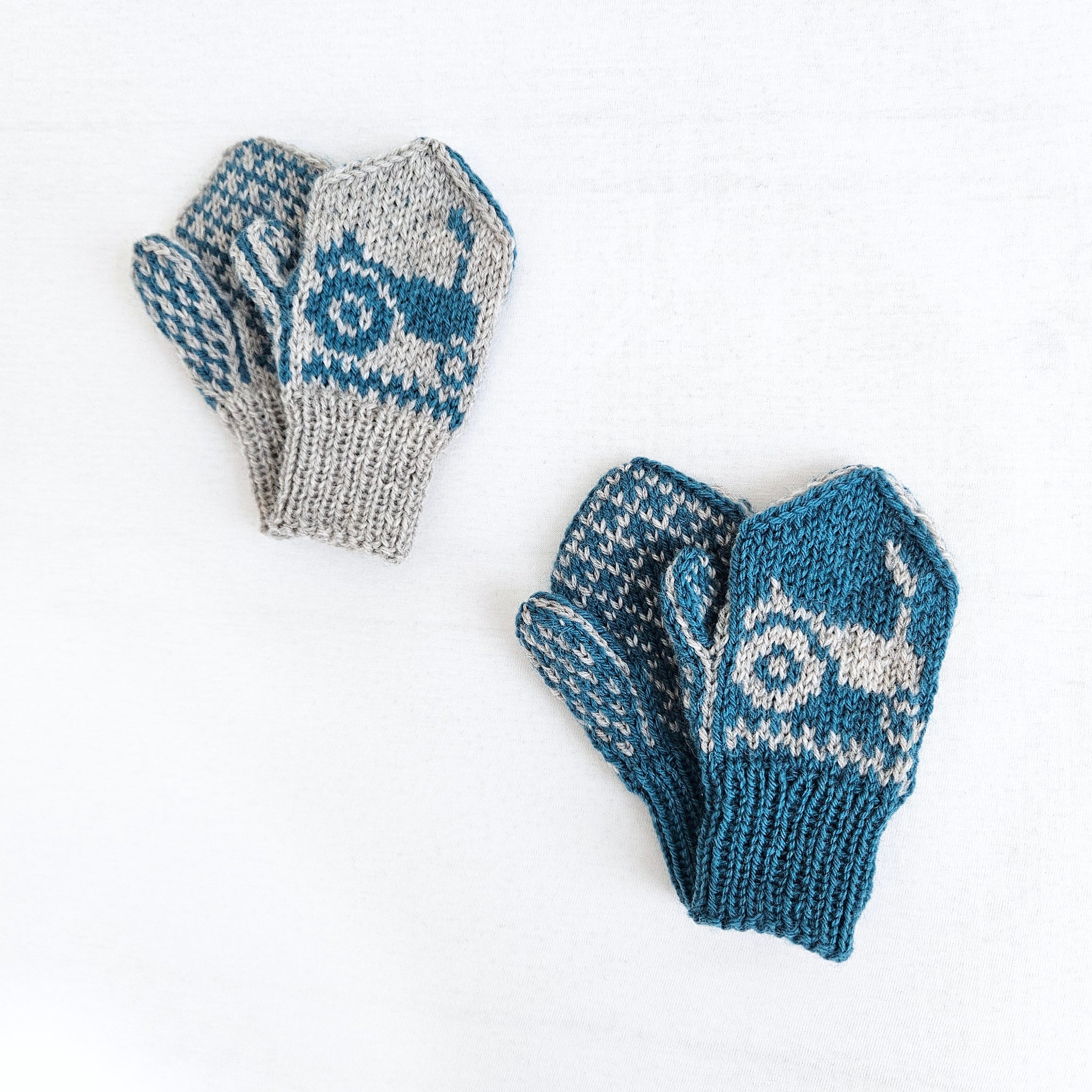 Oppskriften har ett diagram for hver vottehånd, og traktorene er speilvendte. Denne oppskriften er et godt valg for deg som vil ha lett gjenkjennelige barnehagevotter, eller som vil ha et kjappstrikket restegarnsprosjekt!