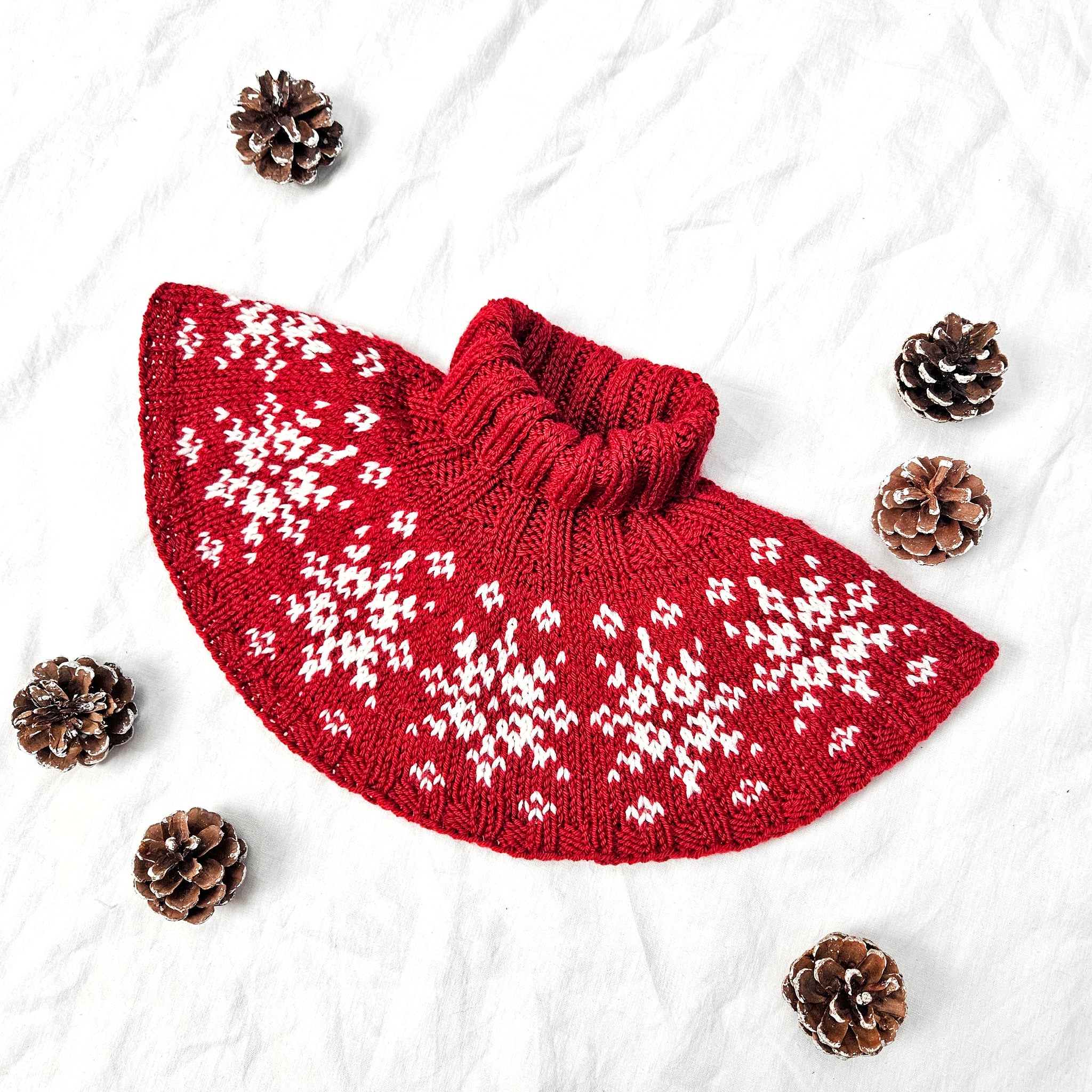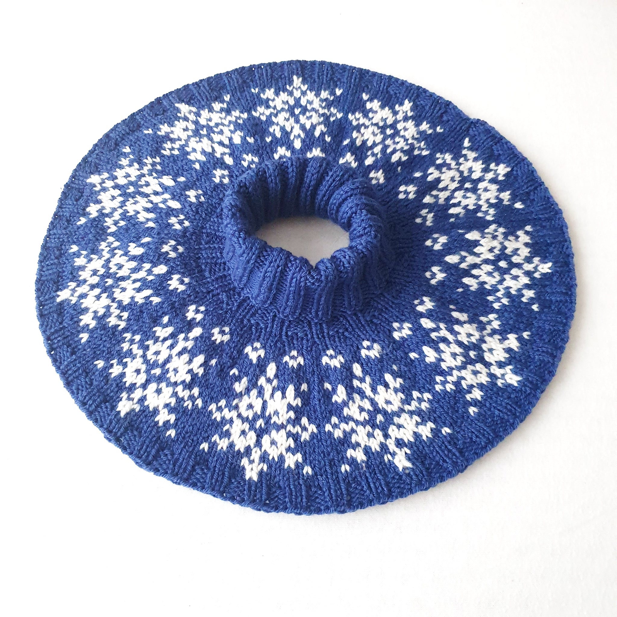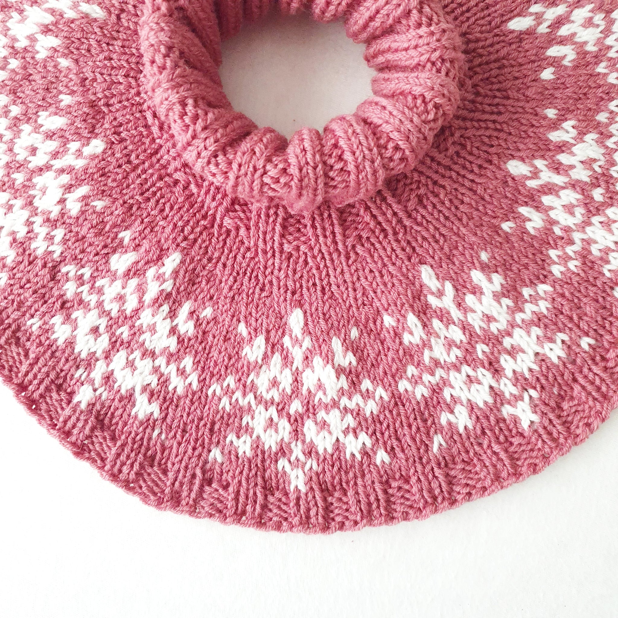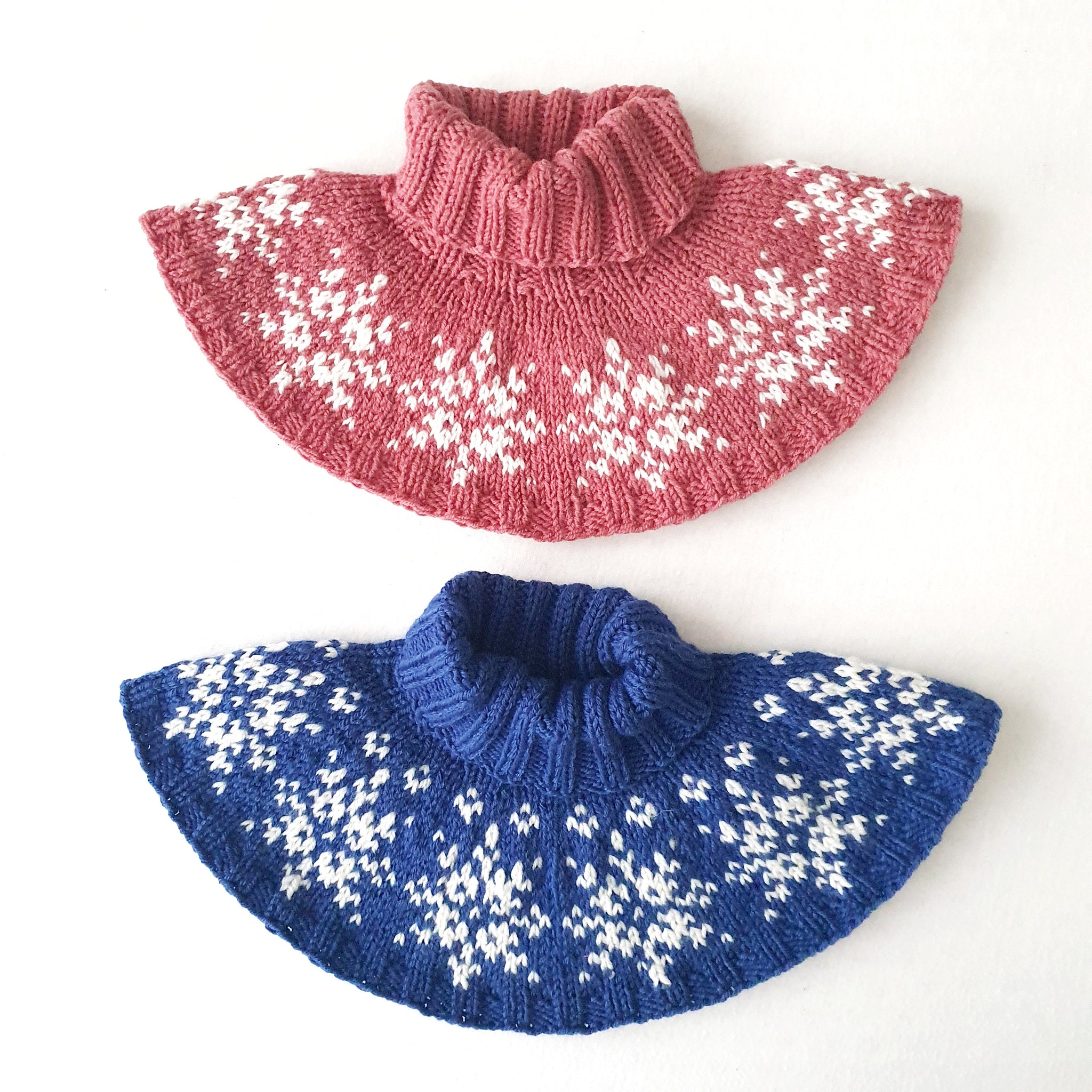Snöflingor halsvärmare är en halskrage stickad uppifrån och ner som en fuskpolo. Stickmönstret inkluderar storlekar för både barn och vuxna.