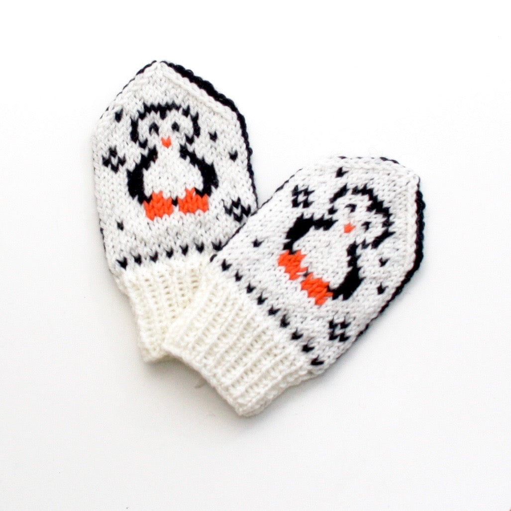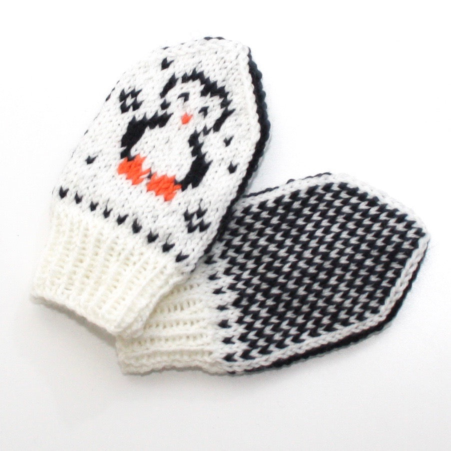 Strikkeoppskrift på babyvotter med pingvinmønster, uten tommel for enkel bruk og god komfort.